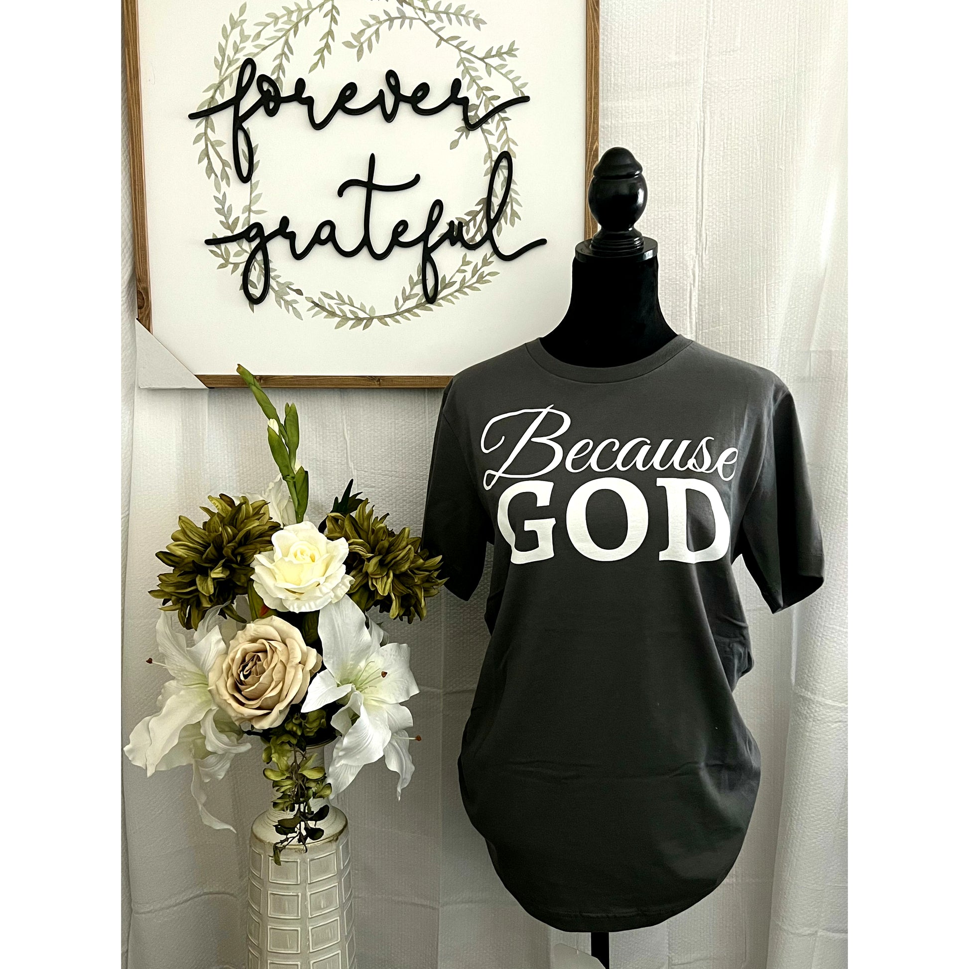 This is our signature shirt. The word "Because" is in cursive to give that human, imperfect touch to the brand. The word "God" is capitalized and bold because God is big and bold. He is the same today, yesterday, and tomorrow. Always mighty. We depend on God. We rest in and on Him.